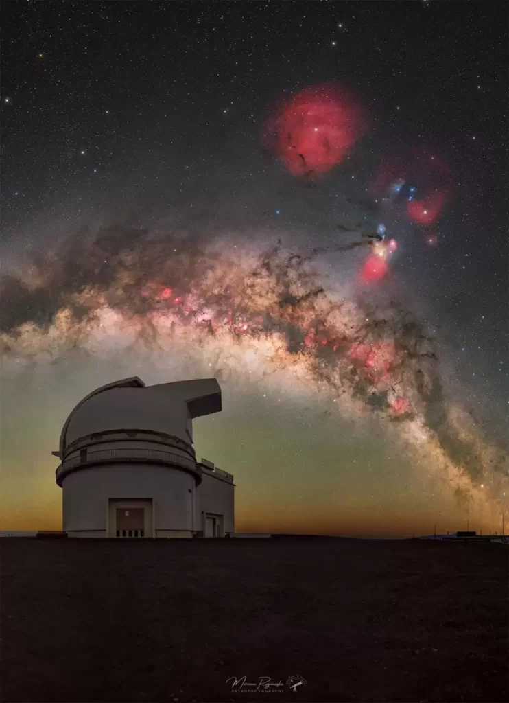 در این تصویر که در اواخر فوریه از مائوناکی (نام یک کوه آتشفشان-م)، هاوایی (Maunakea, Hawaii)، ایالات متحده گرفته شده است، تلسکوپ پیشزمینه، تلسکوپ ۲.۲ متری دانشگاه هاوایی است. خوشبختانه، برای دیدن راه شیری نیازی نیست که نزدیک بالای یک آتشفشان هاوایی باشید.