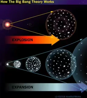در حالی که بسیاری از مردم معتقدند که نظریه مه‌بانگ به یک انفجار اشاره دارد، در واقع به انبساط جهان اشاره دارد. منبع: 2008 HowStuffWorks